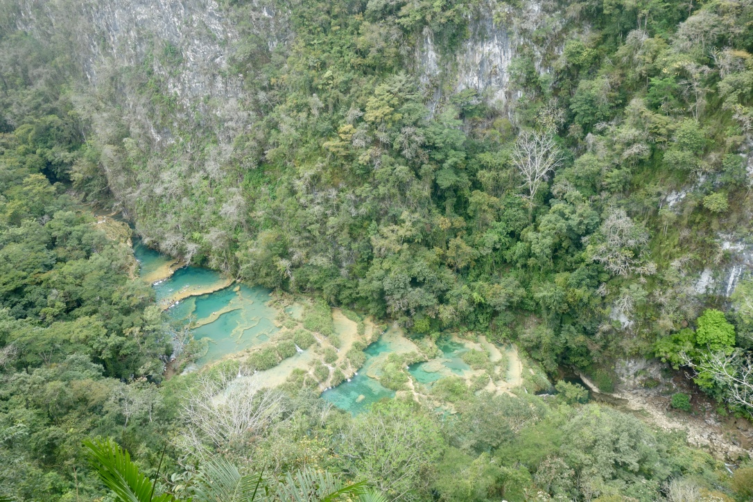 Une fois arrivés à Semuc Champey et l’entrée du parc payée (50qtz quand vous n’êtes pas guatémaltèques, soit 6€30, prix plus que raisonnable vu le site) plusieurs circuits sont proposés : soit vous allez directement faire trempette dans les bassins, soit vous allez admirer les bassins depuis un Mirador. La grimpette est un peu rude mais vaut largement la peine ! Le Mirador étant petit (et vous n’avez pas envie qu’il cède sous le poids de dizaine de touristes) un petit jeune homme vous demandera au bout d’un moment de laisser la place aux autres (moi personnellement il ne m’a rien demandée mais le groupe de 20 personnes qui n’en finissait plus de prendre des photos a été prié de partir^^).