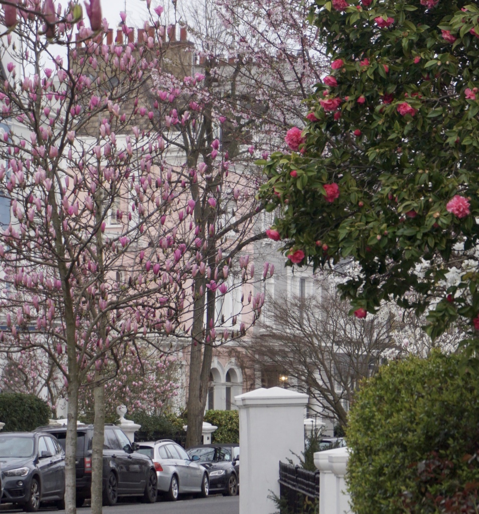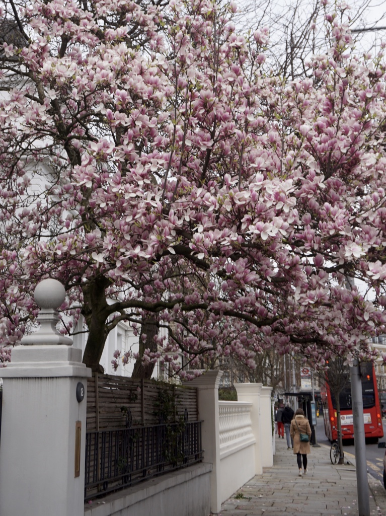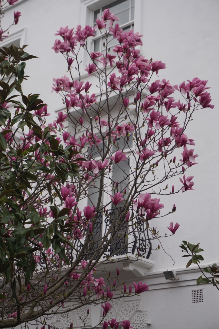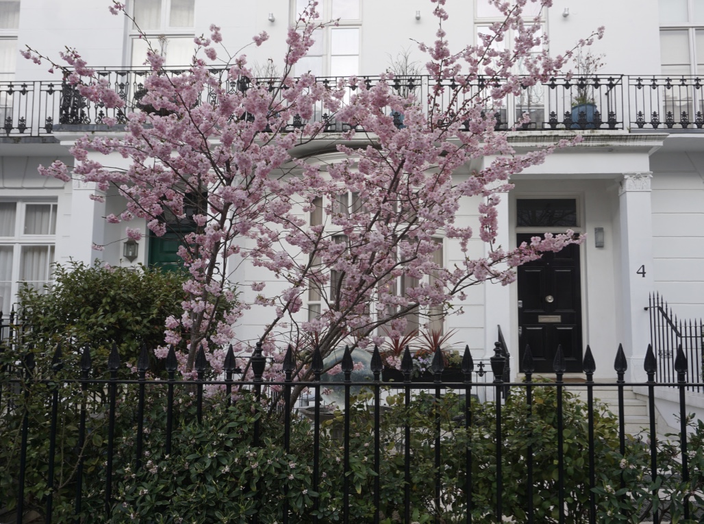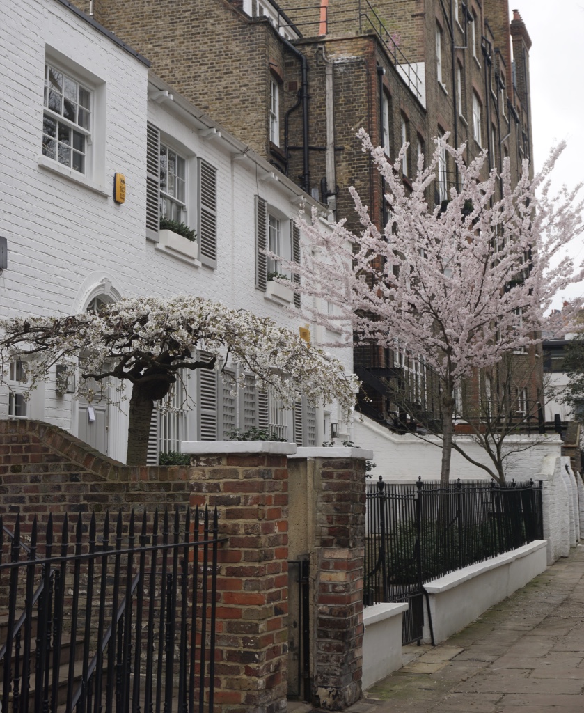 Chelsea/ South Kensington : magnolias, glycine, cerisiers, jonquilles