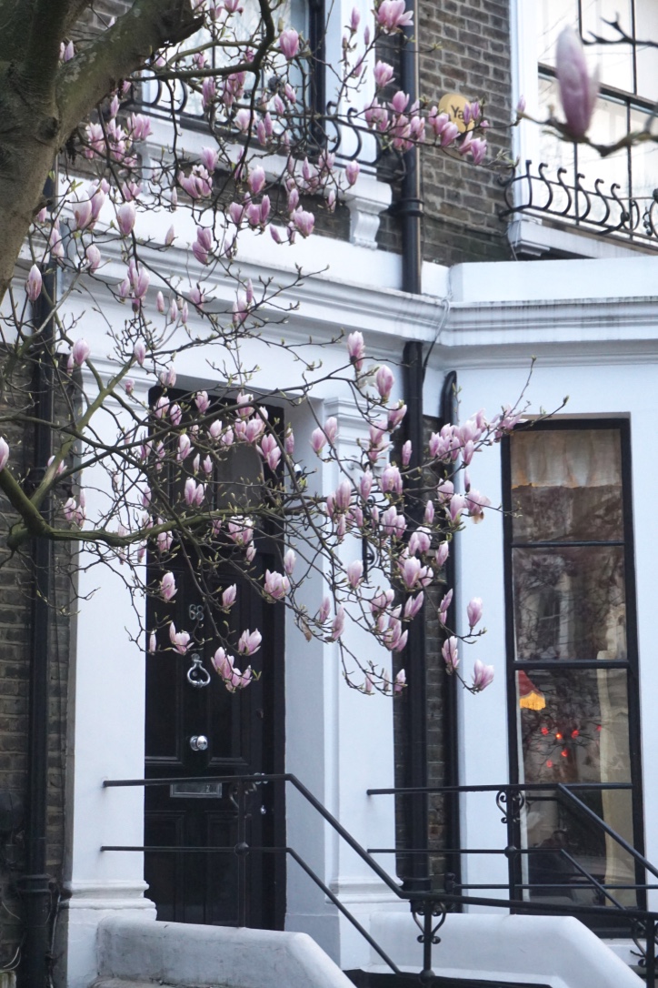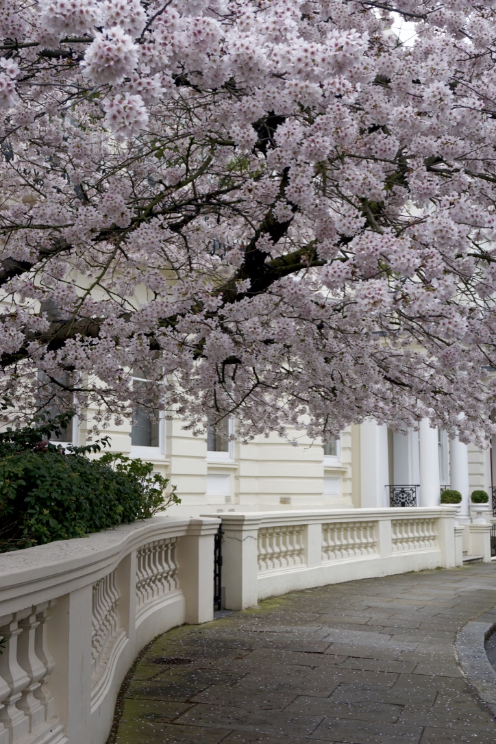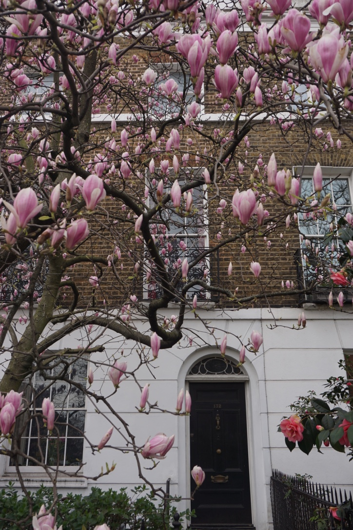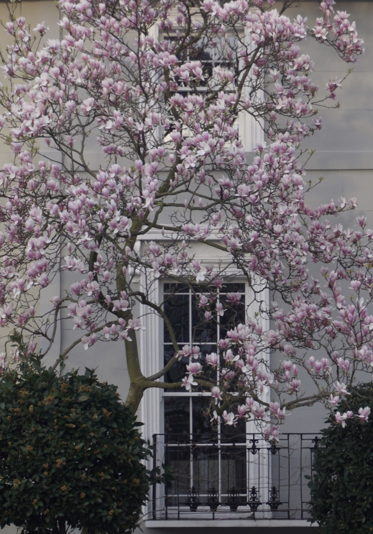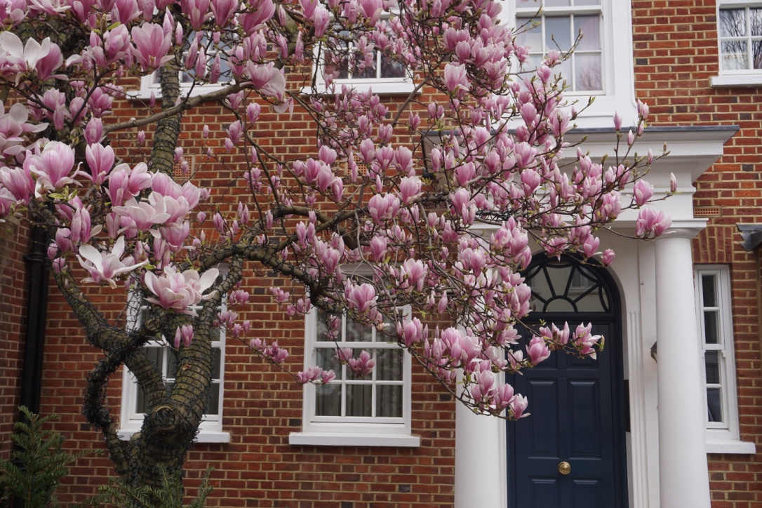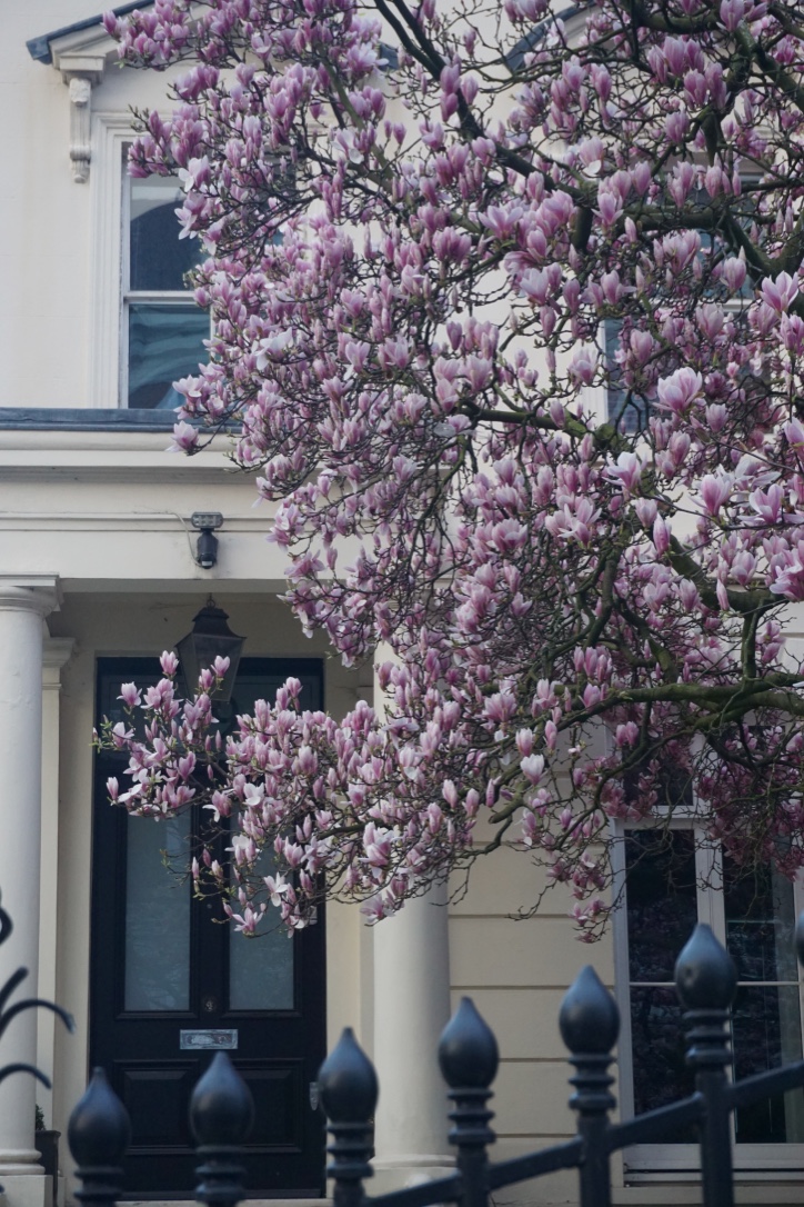 Chelsea/ South Kensington : magnolias, glycine, cerisiers, jonquilles